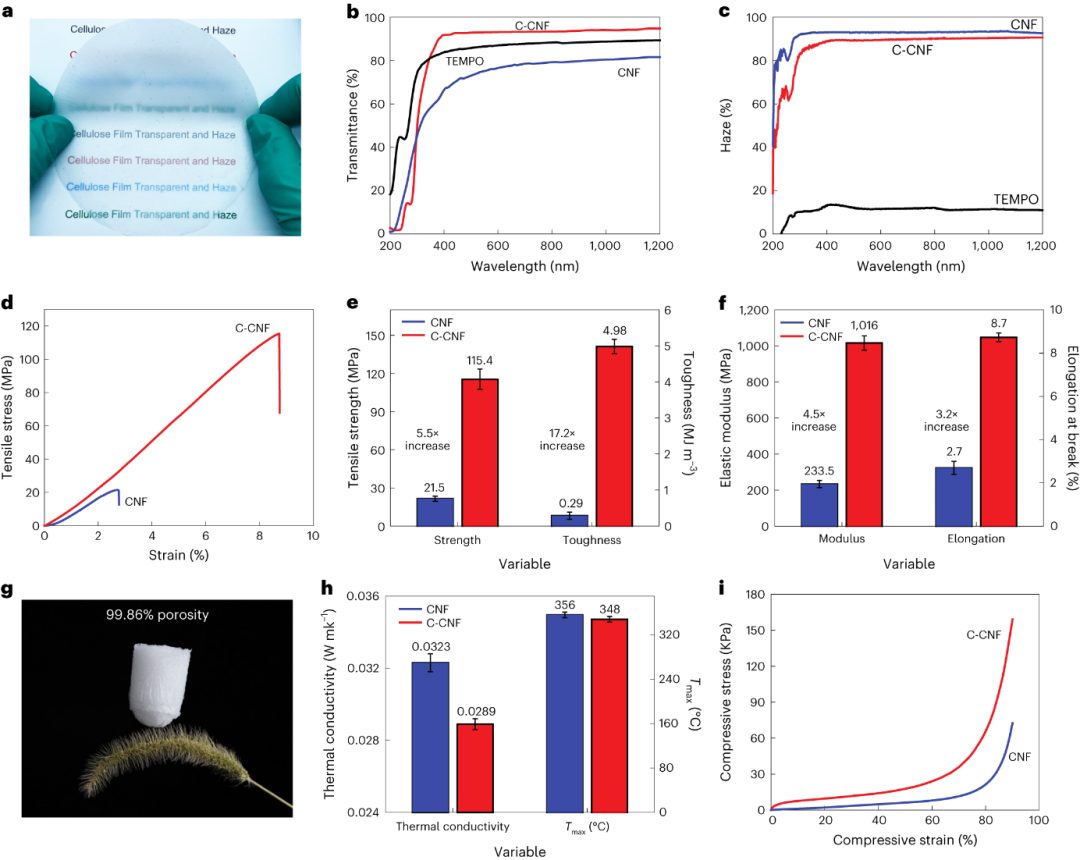 以C-CNFs为原料,通过类似于造纸工艺的溶剂蒸发法,即可制备出具有独特纳米多孔结构的膜材料,该膜材料具有优异的透光性和雾度(图6a-c)。这种兼具高透光率和高雾度的薄膜,在柔性电子学和光电子学方面具有巨大的潜力。该薄膜还表现出非凡的机械性能,拉伸强度达到115.4 MPa,是CNFs薄膜的5.5倍(图6d)。韧性、模量和伸长率分别是CNFs薄膜的17.2倍、4.5倍和3.2倍(图6e和6f)。此外,用C-CNFs合成的气凝胶具有超低的体积密度(0.002 g/cm3)、超高孔隙率(99.86%)(图6g)和可与空气媲美的超低热导率(0.0289 W/mK)(图6h)。这种气凝胶还具有相当高的抗压强度(图6i)和热降解温度(348 °C)。C-CNFs的工业化生产为上述衍生材料的可拓展制备提供了潜力,并展示了大面积高性能结构材料的生产。