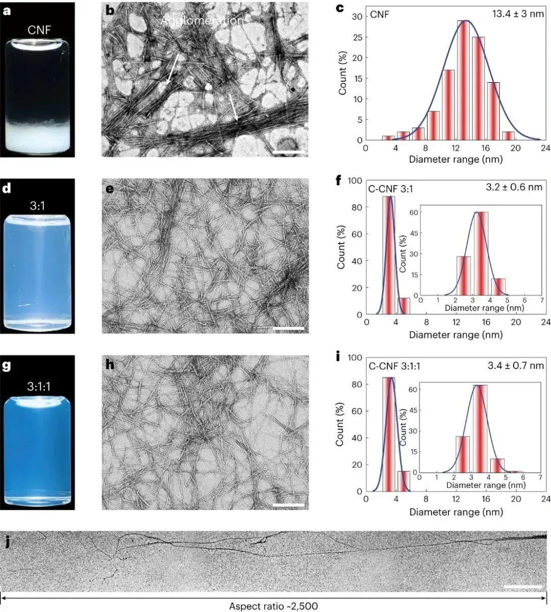 传统方法制备的CNFs直径不均匀,Zeta电位较低,难以形成均匀稳定的悬浮液(图2a-c)。数据显示,CA与ChCl的摩尔比越高,C-CNFs的直径越小,羧基含量越高,从而使悬浮液更加透明,其分散的均匀性和稳定性也得到改善(图2d-f)。不过,混合物中过多的CA会引起纤维素水解,进而降低C-CNFs的长度和产量。通过加水,氢键酸度得到调节,从而防止了纤维素的过度水解。实验结果表明,CA:ChCl:H2O的理想比例为3:1:1,产出的C-CNFs主要由单根基元纤丝组成,平均直径和长度分别约为3.4 nm和7.5 μm(图2i),长径比高达2500(图2j)。