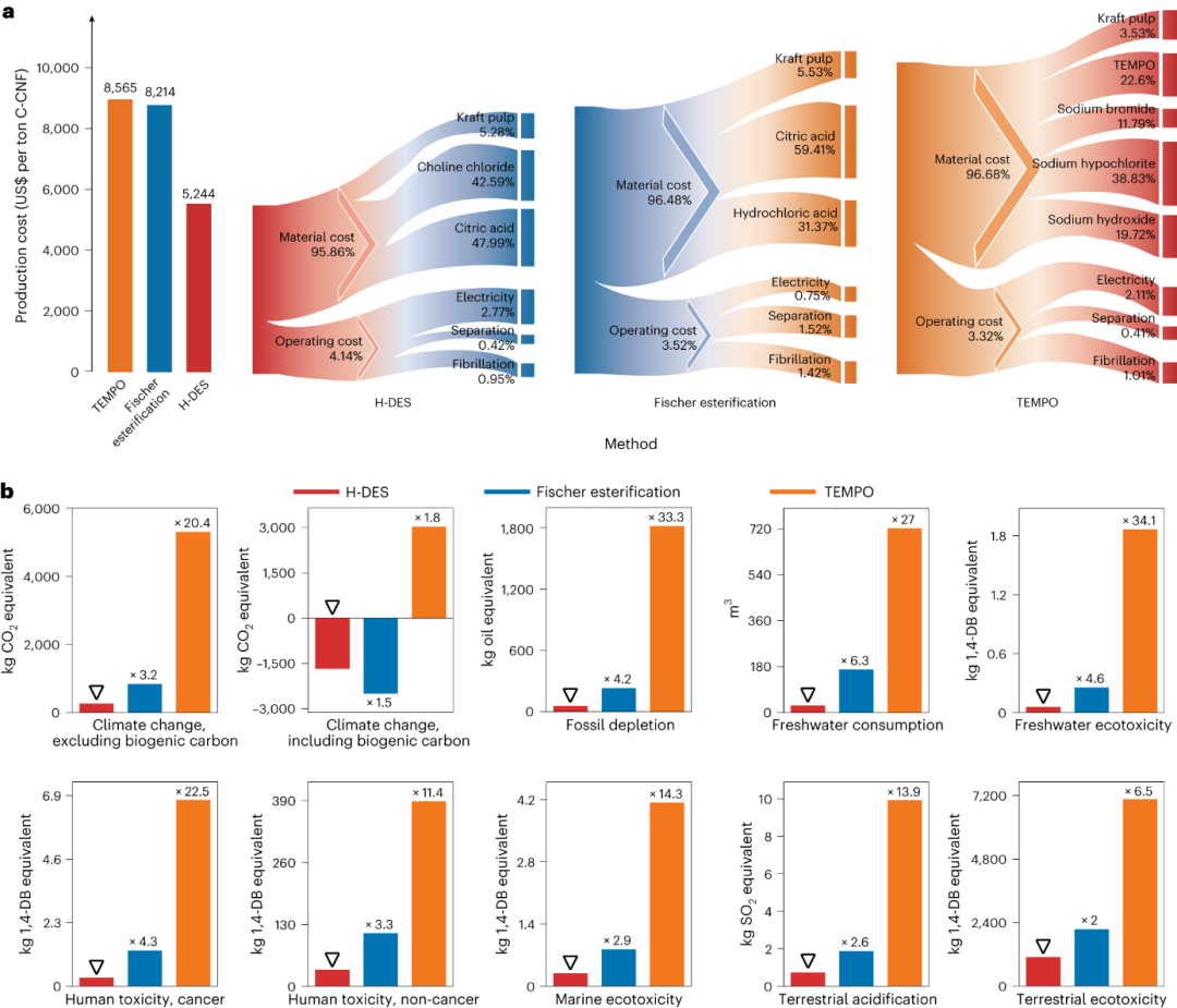 通过综合评估三种常用技术的生产成本,确定了C-CNFs工业化生产的商业可行性和生态影响。结果表明,H-DES方法具有明显优势,其生产成本明显更低,分别比费歇尔酯化法和TEMPO氧化法低63.85%和61.23%(图5a)。需要注意的是,在所有方法中,溶剂化学品和原料费用占比最高。因此,采用一种低材料成本和可循环的方法尤为重要。H-DES技术具有出色的可回收性和可重复使用性,是进一步优化的理想选择,有可能带来更大的经济效益。生命周期评估(LCA)的结果表明,H-DES方法对环境的影响均较低(图5b),且H-DES的循环使用会进一步减少对环境的影响。由此可以避免现有方法大量使用矿物酸和强碱而显著增加化石消耗、淡水使用、陆地生态毒性的问题。