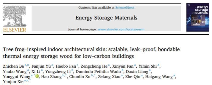 生物质材料科学与技术教育部重点实验室/木质新型材料教育部工程研究中心谢延军教授和王永贵教授团队联合芬兰奥博学术大学徐春林教授和张昊博士后团队,在国际能源材料顶级期刊Energy Storage Materials(IF=20.2)上发表了题为Tree Frog-Inspired Indoor Architectural Skin: Scalable, Leak-Proof, Bondable Thermal Energy Storage Wood for Low-Carbon Buildings的研究论文。该研究提出了一种嵌段共聚和氢键作用协同提升热能储存木材的防泄漏策略,在此基础上,受青蛙脚掌微纳结构和多极性黏液的启发,基于木材单板表面的多层级结构和相变体系引入的极性单体,开发了一种兼具可胶合和防泄漏性能的热能储存人造板,在被动节能木质复合建筑材料领域展现广阔的应用前景。