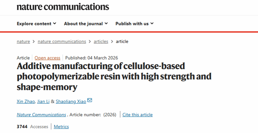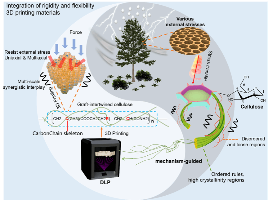 近日,李坚院士、肖少良教授团队,在国际综合期刊《自然·通讯》(Nature Communications)发表题为“Additive manufacturing of cellulose-based photopolymerizable resin with high strength and shape-memory”的研究论文。该研究将植物细胞壁纤维素微纤丝的“应力耗散”机制成功应用于光固化树脂设计,实现了以纤维素为主要碳源直接合成数字光处理 (DLP) 3D打印树脂材料,该材料不仅具有优异的刚柔并济特性(抗压强度和刚度分别达到115.42 MPa和1404.16 MPa),同时具备良好的形状记忆性能。这一创新成果为制造高性能防护部件、能量吸收系统及智能记忆材料提供了新方法,为木质生物质资源在高性能3D/4D打印材料的高值化利用提供了理论支撑。