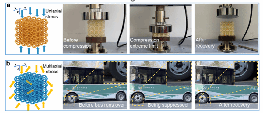 论文第一作者、我校2022级博士研究生赵鑫介绍,当前主流的3D打印树脂材料普遍存在“强度——韧性——形状记忆”三者在光固化3D打印工程材料中难以协同的难题。该研究受植物细胞壁中纤维素微纤丝的“应力耗散”机制的启发,以微晶纤维素为主要原料,通过精确调控纤维素的分子接枝、功能化改性和DLP打印条件的协同作用,开发了此纤维素基快速光固化树脂,该树脂可通过DLP技术以每层5-10秒的速度实现快速、高精度的复杂精密结构打印。打印出的材料兼具高强度(压缩强度115.42 MPa)、高刚度(弹性模量1404.16 MPa)和快速形状记忆能力(恢复率94.5%,恢复时间4-5分钟)。本研究将“植物细胞壁纤维素微纤丝滑移耗能”这一机制转化为可工程化的材料设计策略,构建了纤维素基DLP光固化树脂,并在打印固化后实现了工程材料3D打印中难以同时满足的三项关键能力:高强度承载、韧性耗能/可恢复和形状记忆响应。该研究为可持续高性能光固化树脂、结构化能量吸收器件、可部署/可恢复构件以及3D/4D打印器件提供了新的材料基础与设计方法。