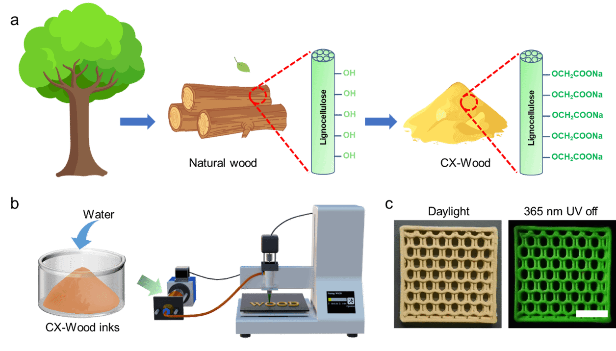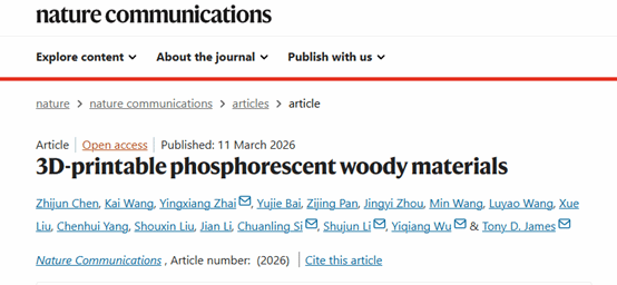 近日,生物质材料科学与技术教育部重点实验室生物质光功能材料团队翟迎香副教授与合作者在国际综合期刊《自然·通讯》(Nature Communications)发表题为“3D-printable phosphorescent woody materials”的研究论文。该研究首创绿色改性策略,成功制备出兼具室温磷光性能且可通过直写式3D打印(DIW)技术直接加工为多样定制化形状的新型木质功能材料(CX-Wood),实现了智能发光材料的绿色化、定制化制备,为建筑装饰、智能传感、防伪标识等领域提供了创新解决方案。