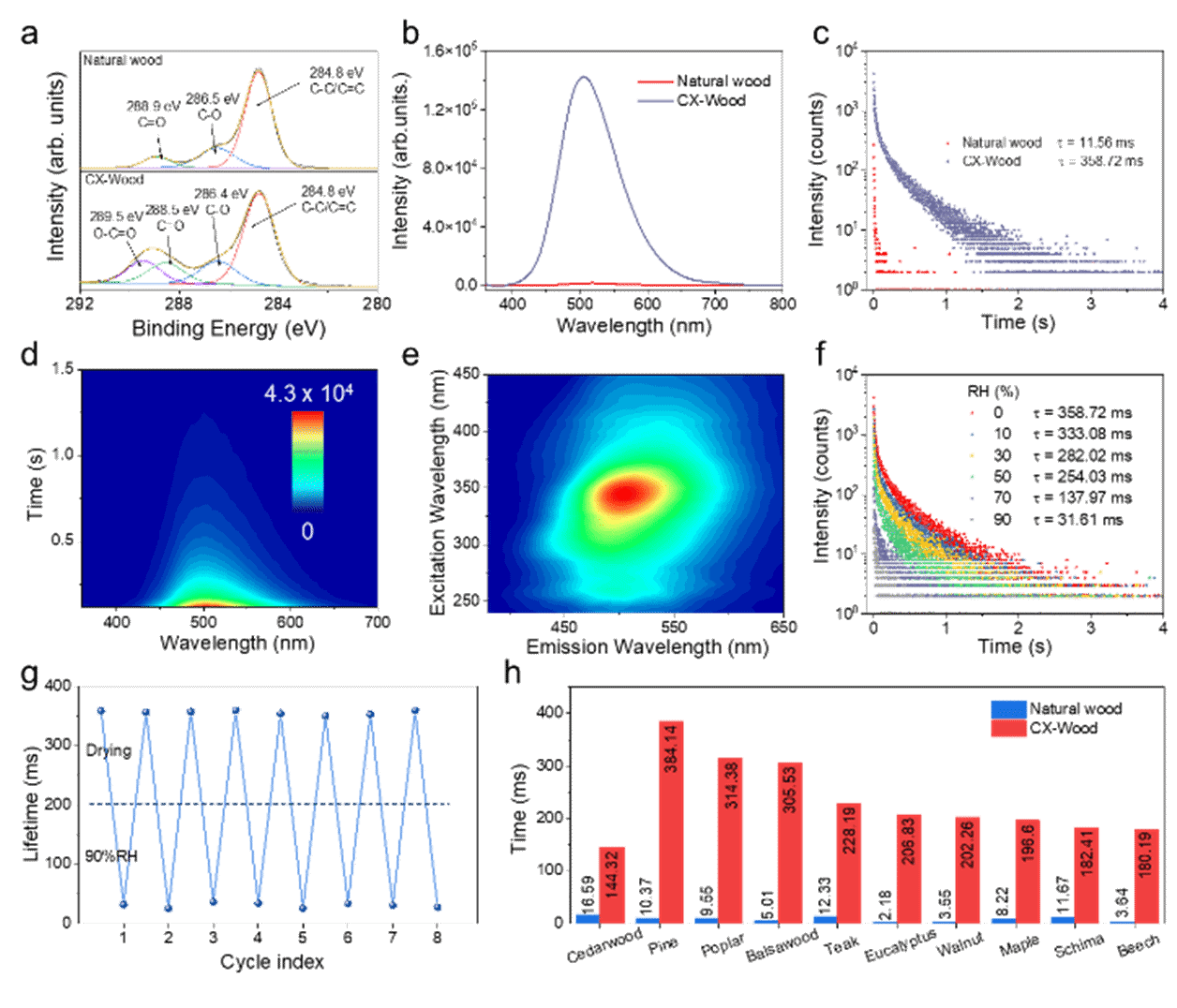 CX-Wood材料凭借其卓越的综合性能与绿色可持续特性,展现出广阔的应用前景。实验数据显示,该材料室温磷光寿命最高可达358.72 ms,且湿度响应可逆性优异,在多次循环后性能依然保持稳定。其全球变暖潜能值(GWP)低于其他报道的DIW墨水,环保优势显著。